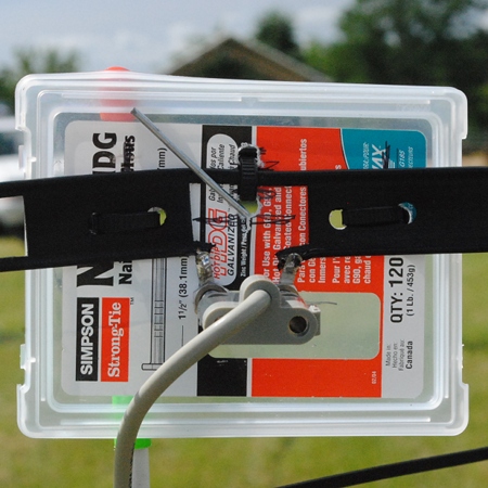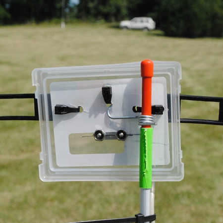 The electric fence posts have companion metal clips that you can adjust to any height with a simple squeeze and slide. This is absolutely wonderful for antenna fiddling.