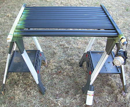 Two coats of flat black paint later and the aluminum antenna pieces are ready for installation. Note the left portion of most of the pieces are masked with tape to ensure bare aluminum mates inside the next larger piece metal to metal.