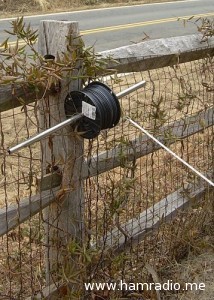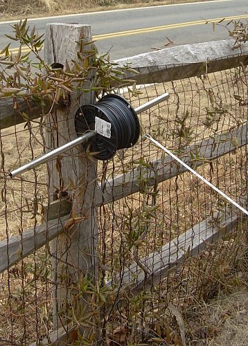 A supply of 14 AWG Stranded Copper radial wire tied to my fence ready to help pull and cut 33 foot or so radials for the 43 foot antenna.