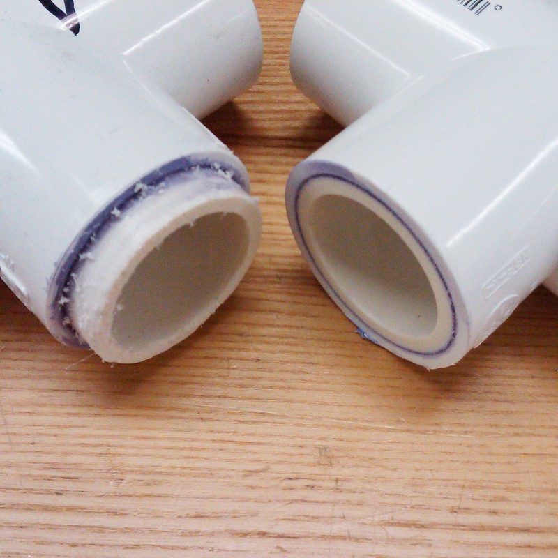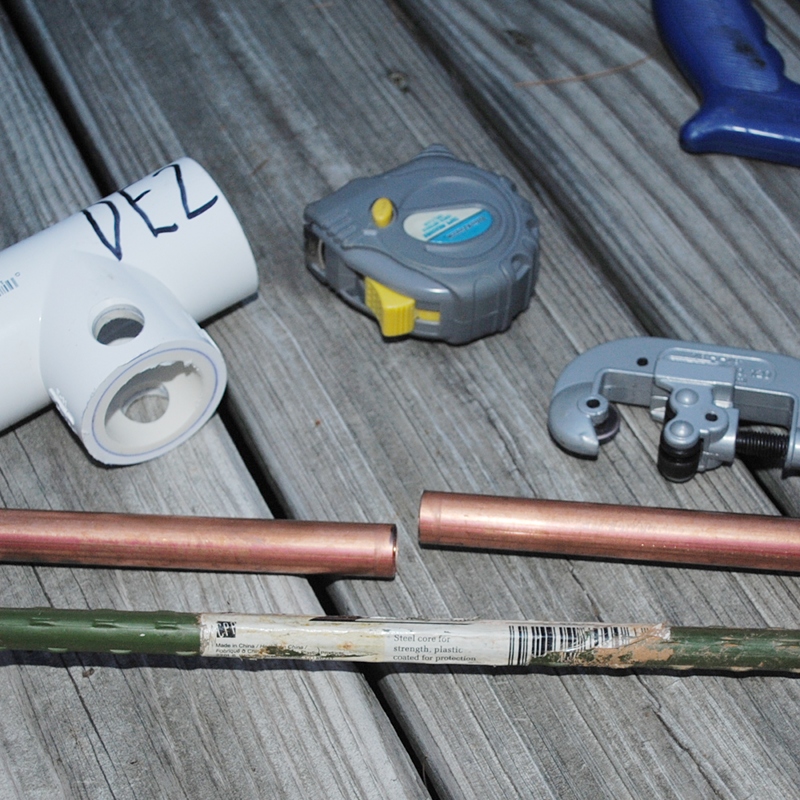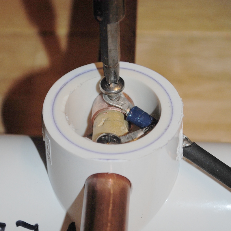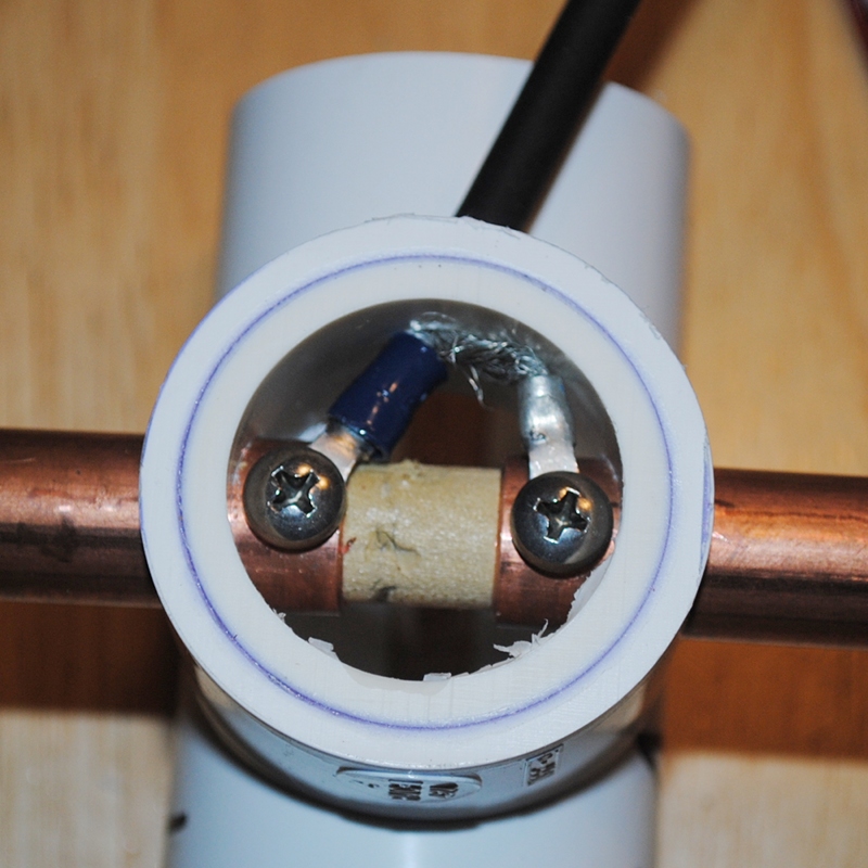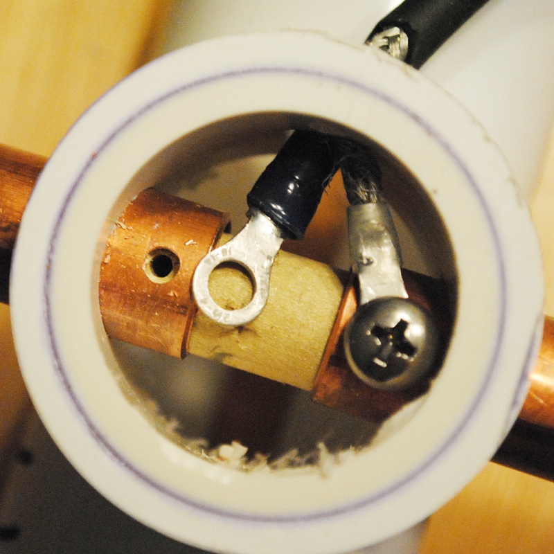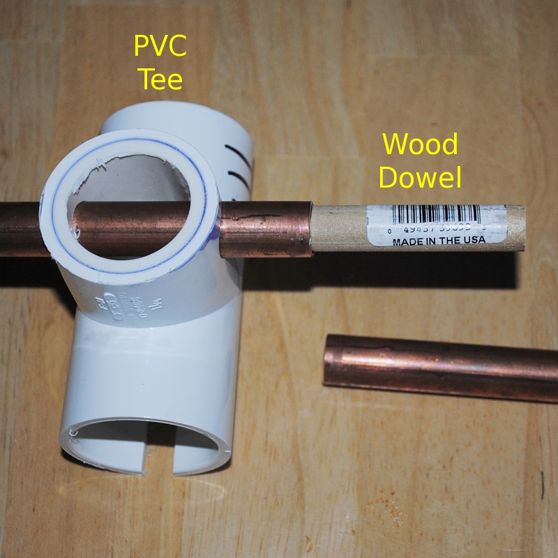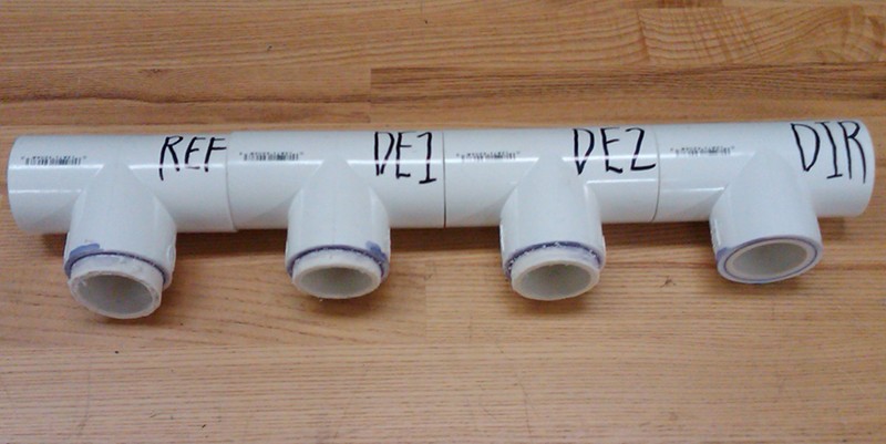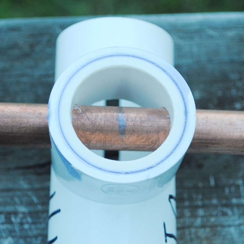 The boom mounting materials use PVC plumbing tees with a PVC pipe glued in to strengthen the holes which hold the copper pipe elements onto the boom. This inspiration for this technique came from K5DIY featured on Justin’s 6m web page.