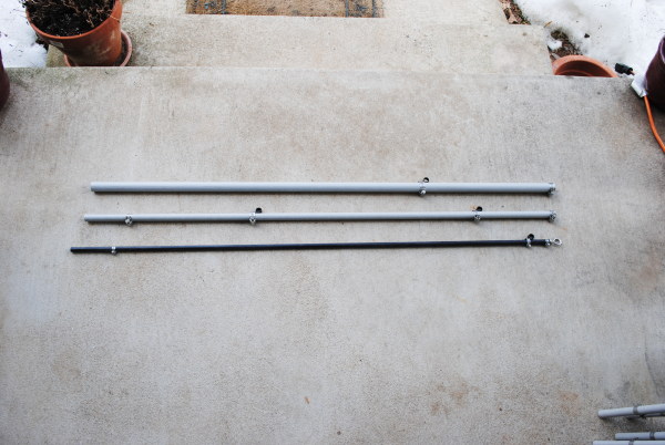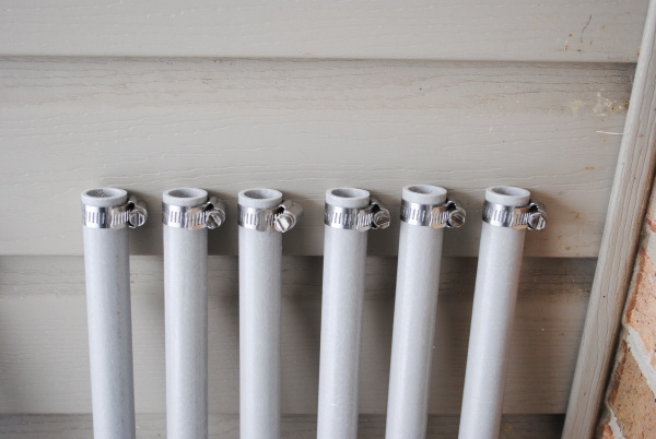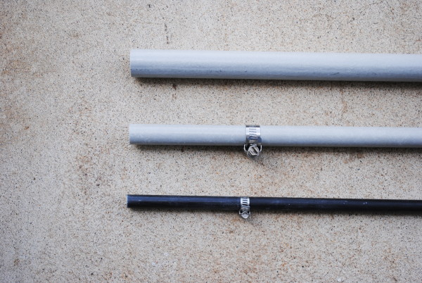 Not discussed are the two 1 inch x 48 inch fiberglass poles also shipped by Max-Gain. One of these poles is for the vertical center pole of the antenna. The other is simply a spare pole that comes with the fiberglass kit. I wound up using PVC for the center pole and saved the other pole for future possibilities. However, I did make good use of the spare pole; I used some of it to reinforce the PVC from the bottom of the antenna to just above the hub. The 1 inch fiberglass tube fits perfectly inside 1-1/4 inch PVC. This allayed my concerns the PVC pipe would simply crush when clamped into the rotator and the PVC would buckle during rough handling. The fiberglass pole inside the PVC pipe provides a sturdy inner core.