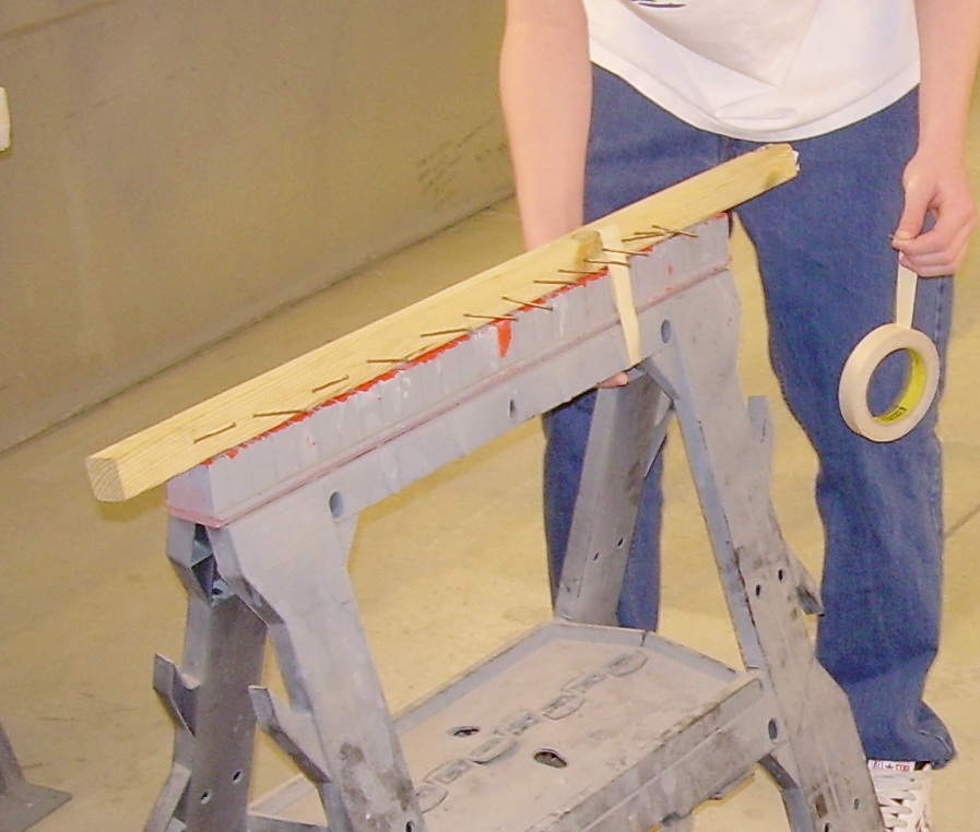 We hammered in 14 finish nails and ever decreasing separation to keep the gap between the various pipe sizes about the same.