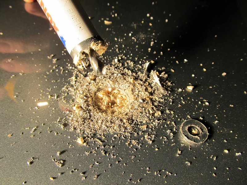 Drilling complete, the new 3/4 inch hole awaits inspection, but, for now, is hidden by all the bits of material.